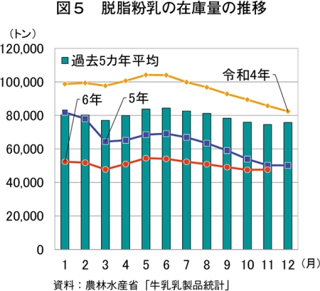 11月の脱脂粉乳の生産量は、1万1172トン(前年同月比5.3%増)と前年同月からやや増加し、4カ月連続で上回った(図4)。一方、出回り量は1万1058トン(同22.8%減)と5カ月連続で下回った(農畜産業振興機構調べ)。在庫量は、在庫低減対策の効果もあって、令和4年10月以降前年同月減で推移し、11月末は4万7623トン(同5.2%減)と、3カ月連続で5万トンを下回ったものの、6カ月ぶりに前月の在庫量を上回った(図5)。