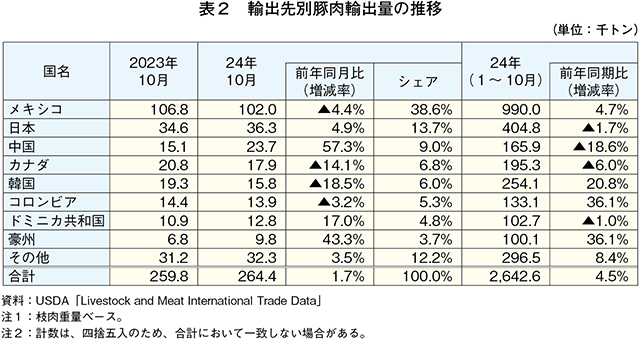 米国農務省経済調査局(USDA/ERS)によると、2024年10月の豚肉輸出量は26万4400トン(前年同月比1.7%増)とわずかに増加した(表2)。最大の輸出先となるメキシコ向けは、米国内での豚肉卸売価格の上昇や米ドルに対するメキシコペソ安の影響により、10万2000トン(同4.4%減)とやや減少した。日本向けは冷凍豚肉を中心に3万6300トン(同4.9%増)とやや増加した。
