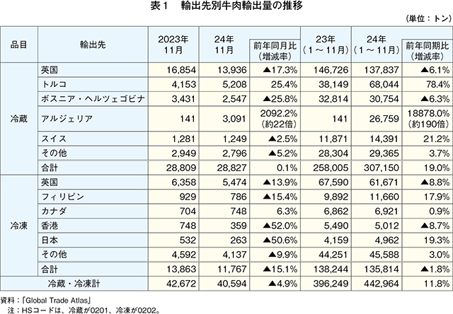 2024年11月の牛肉輸出量は、4万594トン(前年同月比4.9%減)とやや減少した(表1)。同年1〜11月の累計牛肉輸出量は44万2964トン(前年同期比11.8%増)となった。冷蔵牛肉の主要輸出先である英国向けなどは減少したものの、家畜疾病への懸念などから生体牛の輸入を制限しているトルコ(同78.4%増)や国内需要が高まるアルジェリア(同約190倍)向けが輸出量全体を押し上げた。