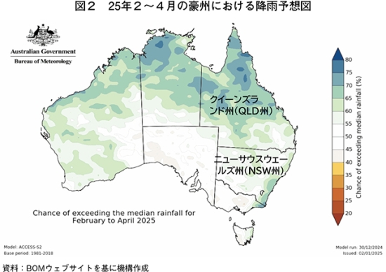 肉牛生産に影響する今後の降雨予想について豪州気象庁(BOM)は、25年2〜4月にかけて主要肉用牛生産地域であるクイーンズランド州、ニューサウスウェールズ州を中心に平年以上の降雨を予想している(図2)。このため、牧草の確保が容易となることで牧草肥育農家からの需要増が想定される。一方、複数の農業系アナリストは、市場に供給される牛の供給量が増えるため、7月まで価格は軟化して推移すると予測している。