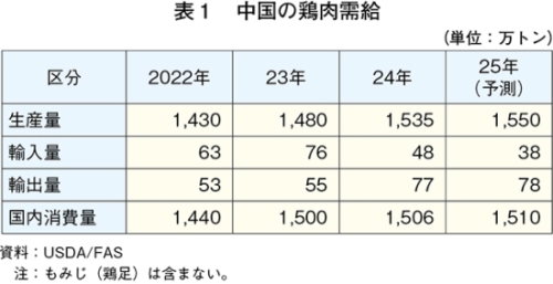米国農務省海外農業局(USDA/FAS)の直近見通しによると、25年の中国の鶏肉生産量(注1)は1550万トン(同1.0%増)とされ、過去最高を記録した24年を上回ることが見込まれている(表1)。この要因として、飼料コストの減少や中国国内の優良遺伝子を用いた生産能力の強化が挙げられている。