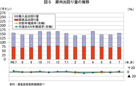 推定出回り量は、15万5629トン(同0.8%減)と前年同月をわずかに下回った(図5)。このうち、国産品は7万1374トン(同2.4%減)と前年同月をわずかに下回った一方、輸入品は8万4255トン(同0.6%増)と前年同月をわずかに上回った。