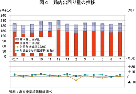 令和7年7月の鶏肉生産量は、14万2858トン(前年同月比2.2%増)と前年同月をわずかに上回った(図1)。