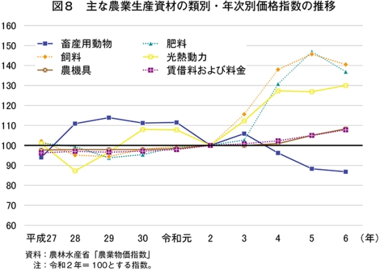 (注2)農業生産資材価格指数(総合)の算出に用いる類別のウエートは、全体を100とした場合、畜産用動物は11.31、肥料は7.76、飼料は22.96、光熱動力は8.50、農機具は13.26、賃借料および料金は6.27などとなっている。