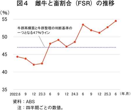 豪州統計局(ABS)が2025年8月に公表した統計によると、25年第2四半期(4〜6月)の牛のと畜頭数は、四半期としては過去2番目の水準となる233万8200頭(前期比7.6%増)、牛肉生産量も同じく過去最高となる71万7891トン(同5.7%増)を記録した(図3)。堅調な輸出需要による牛肉加工のマージン拡大が記録更新に貢献した。雌牛と畜割合(FSR)は54.5%に上昇しており、引き続き雌牛の出荷が進んでいることを示している(図4)。他方で、前述の通り、これから春にかけて若い繁殖雌牛の導入が加速すると見込まれることから、27年以降とされていた牛群が増加局面に転じるタイミングは早まる可能性がある。