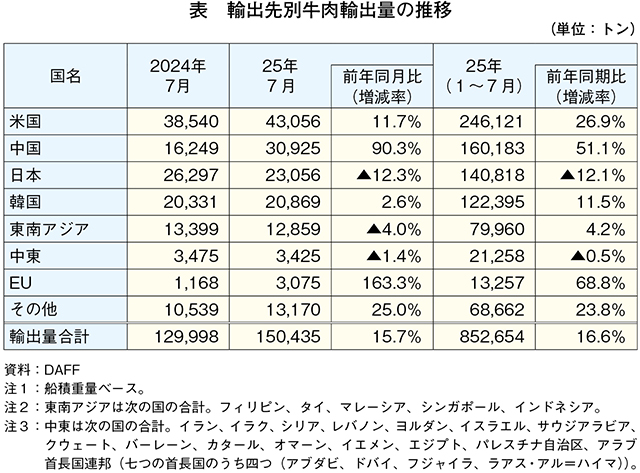 25年7月の牛肉輸出量は15万トン超え、記録更新が続く