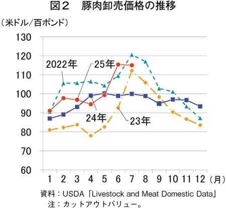 USDA/NASSによると、25年7月の豚肉卸売価格(カットアウトバリュー(注1))は、豚肉生産量の減少と堅調な需要から、100ポンド当たり115.03米ドル(1キログラム当たり375円:1米ドル=147.92円(注2)、前年同月比15.1%高)と、前年同月をかなり大きく上回った(図2)。また、同月の肥育豚価格は、同78.2米ドル(同255円、同19.2%高)と大幅に上回った。