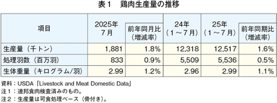 米国農務省経済調査局(USDA/ERS)によると、2025年7月の鶏肉生産量は、処理羽数と生体重量の増加により、188万1000トン(前年同月比1.8%増)とわずかに増加した。また、25年1〜7月の鶏肉生産量は1251万7000トン(前年同期比1.6%増)とわずかに増加した(表1)。同年の鶏肉生産量についてUSDAは、堅調な孵化数や飼料コストの低下から、前月予測から3万3000トン上方修正し、2131万6000トン(前年比1.6%増)と予測している。