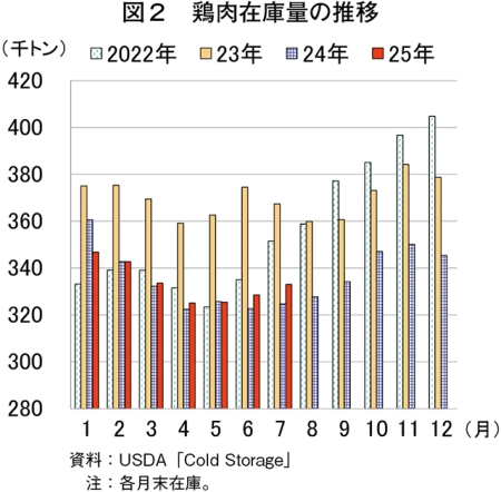 USDA/ERSによると、2025年7月の鶏肉卸売価格は、1ポンド当たり1.31米ドル(1キログラム当たり429円:1米ドル=147.92円(注)、前年同月比0.6%高)とわずかに上昇した(図1)。鶏肉生産量は前年同月比で増加しているものの、食肉全般が高値で推移する中、比較的安価な鶏肉の需要が高まったことが上昇につながったとみられる。同月末の冷凍鶏肉在庫量は、国内需要の高まりなどを背景に生産量が増加する中で、輸出量が減少したことなどから33万3025トン(同2.6%増)とわずかに増加した(図2)。