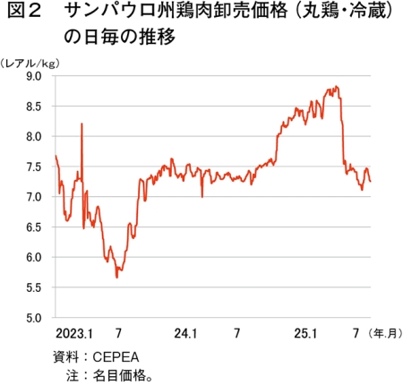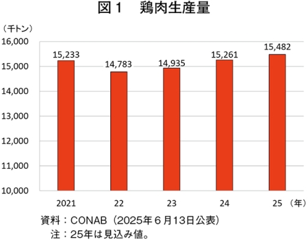 また、ブラジル国家食糧供給公社(CONAB)によると、25年のブラジルの鶏肉生産量は1548万2000トン(前年比1.4%増)と前年をわずかに上回ると見込まれている(図1)。これは、国内外の堅調な需要が主な要因と考えられている。