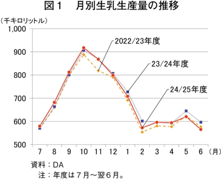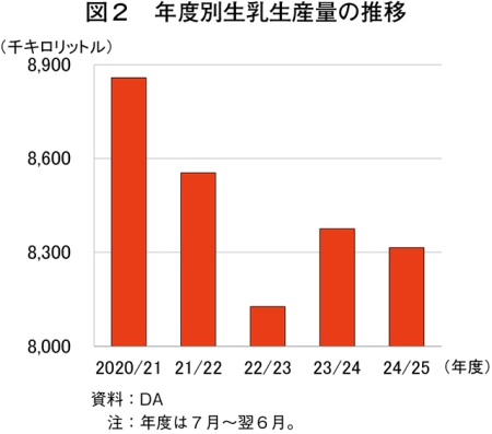 この結果、24/25年度(7月〜翌6月)の生乳生産量は、前年度比0.7%減の831万5020キロリットル(856万4471トン相当)とわずかに減少した(図2)。