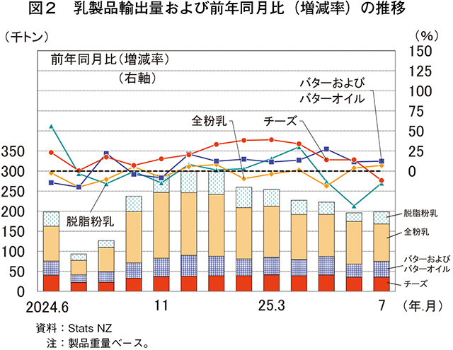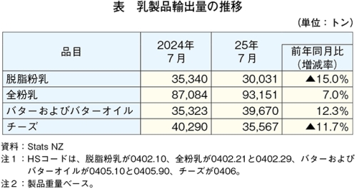 25年7月の脱脂粉乳およびチーズの輸出量減少