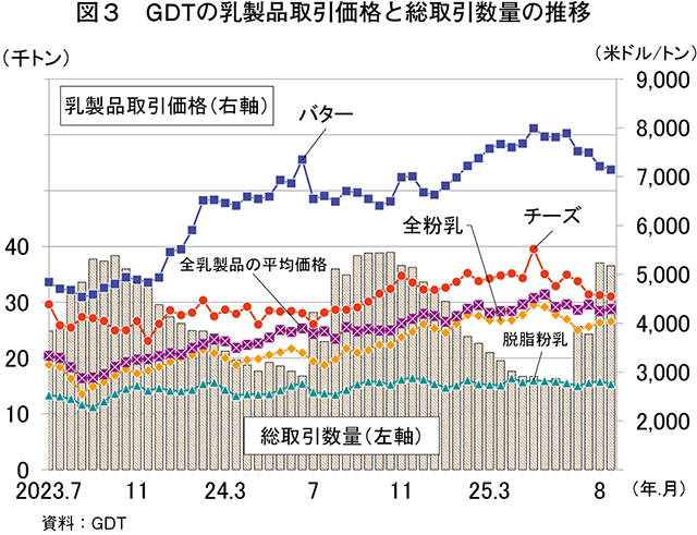 2025年8月19日開催のGDT(注1)平均取引価格は、全粉乳が前回開催時(25年8月5日)を上回った(図3)。北東アジア、中東、中南米からの需要が増加したため、全乳製品の平均取引価格は1トン当たり4291米ドル(63万4725円、1米ドル=147.92円(注2)、前回比1.0%高)となった。