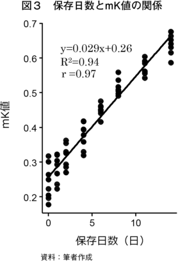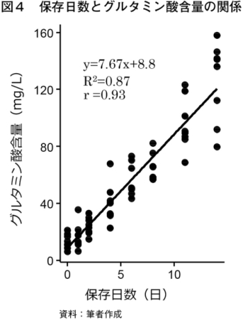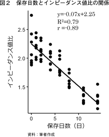 その結果、保存日数が経過するとインピーダンス値比が低下し、mK値およびグルタミン酸含量が増加することが明らかになった。インピーダンス値比の低下は、熟成に伴う細胞膜の劣化やタンパク質の分解によるイオン移動の促進が要因と考えられる。一方、mK値の増加はATP分解過程の進行を反映し、熟成度を示す指標として信頼性が高いことが示唆された。また、グルタミン酸含量の増加はタンパク質分解の進行による遊離アミノ酸の生成が主な要因であり、熟成によるうま味成分の向上を示唆している。さらに、mK値とグルタミン酸含量の間には強い正の相関が認められ、熟成の進行とともに両者が連動して変化することが明確となった。