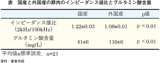 市販豚肉の比較では、国産は外国産に比べてインピーダンス値差が大きく、グルタミン酸含量が低いことが確認された。これは、外国産豚肉が長期間のチルド輸送を経ることで熟成が進行し、タンパク質の分解が進んだためと考えられる。また、インピーダンス値差とグルタミン酸含量の間には負の相関が認められ、これらの指標によって熟成度や美味しさを評価できる可能性が示唆された。