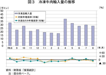 8月の輸入量について、冷蔵品は、国内需要が低調な中、現地価格の高止まりの影響などにより、主要輸入先のうち米国産の減少が見込まれることなどから、1万4950トン(前年同月比6.4%減)と前年同月をかなりの程度下回った(図2)。冷凍品では、米国産ショートプレート(バラ)は現地価格の軟化から輸入量が増加したものの、総じて現地価格は上昇しており、ほとんどの輸入先からの輸入量が減少したことなどから、2万8241トン(同14.1%減)と前年同月をかなり大きく下回った(図3)。この結果、輸入量の合計(注2)でも、4万3219トン(同11.6%減)と前年同月をかなり大きく下回った。