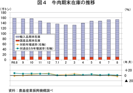 8月の推定期末在庫は、15万2863トン(前年同月比3.4%減)と前年同月をやや下回った(図4)。このうち、国産品は1万476トン(同4.5%減)、在庫の大半を占める輸入品は14万2387トン(同3.3%減)と、ともに前年同月をやや下回った。