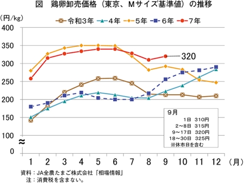 令和7年9月の鶏卵卸売価格(東京、Mサイズ基準値)は、1キログラム当たり320円(前年同月差64円高、前年同月比25.0%高)と、前年同月の同価格を大幅に上回った(図)。同価格の日ごとの推移を見ると、月初の同310円から2日には同315円、9日には同320円、18日には同325円と計3回の上昇があり、月間の上昇幅は同15円となった。なお、過去5カ年の9月の平均卸売価格は227円であり、それと比較しても、41.0%高と大幅に上回る結果となった。