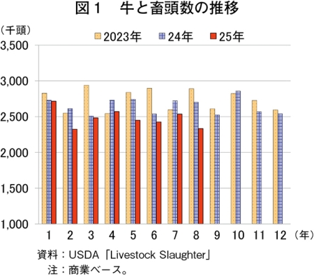 米国農務省全国農業統計局(USDA/NASS)によると、2025年8月のフィードロット導入頭数は178万頭(前年同月比9.9%減)とかなりの程度減少し、さらに出荷頭数は157万1000頭(同13.6%減)とかなり大きく減少した。導入頭数と出荷頭数の減少については、1)牛飼養頭数の減少、2)メキシコからの肥育もと牛の輸入停止(注1)、3)肥育期間の長期化−などが継続している影響とみられる。この結果、同年9月1日時点のフィードロット飼養頭数は1108万頭(同1.1%減)とわずかに減少した。