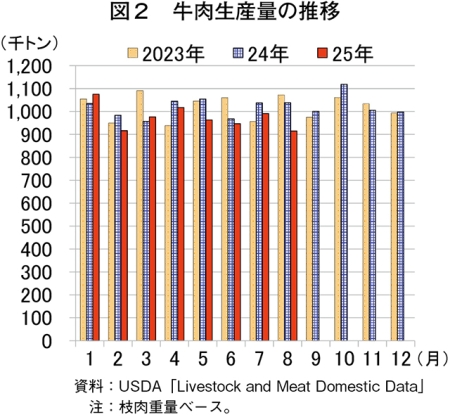このような中、8月の牛と畜頭数は233万3000頭(同13.7%減)とかなり大きく減少した(図1)。その結果、同月の1頭当たり枝肉重量は394.2キログラム(同2.1%増)とわずかに増加したが、同月の牛肉生産量は91万5000トン(同11.9%減)とかなり大きく減少した(図2)。