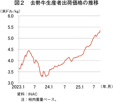 INACによると、2025年9月第3週(9月14〜20日)の去勢牛生産者出荷価格は、1キログラム当たり5.35米ドル(802円:1米ドル=149.88円(注1)、前年同期比31.9%高)と前年同期を大幅に上回った(図2)。これについてUSDAは、輸出向け牛肉の単価が高水準で推移していることが要因としている。