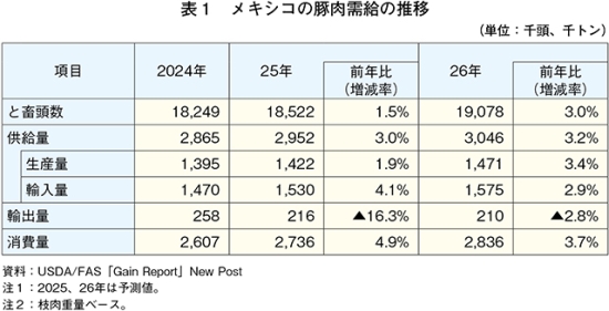 米国農務省海外農務局(USDA/FAS)は2025年8月27日、25年および26年のメキシコの豚肉需給見通しを発表した。これによると、25年の豚と畜頭数は1852万頭(前年比1.5%増)、豚肉生産量は142万トン(同1.9%増)と、いずれもわずかな増加が見込まれている(表1)。また、豚肉消費量は、堅調な外食需要や手頃なたんぱく源を求める消費者による牛肉の代替需要などから、274万トン(同4.9%増)とやや増加すると見込まれている。26年は、ブラジル産などが台頭する輸出量を除き、各項目で前年を上回って推移するとみられている。