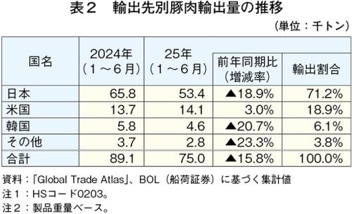 2025年上期(1〜6月)の豚肉輸出量は、7万5000トン(前年同期比15.8%減)とかなり大きく減少した(表2)。輸出先別に見ると、ロースなどが中心となる米国向けは1万4100トン(同3.0%増)となった。一方、輸出先第1位の日本向けは5万3400トン(同18.9%減)、韓国向けは4600トン(同20.7%減)といずれも大幅に減少した。この要因として、アジア圏では、ブラジル産など、より安価な豚肉を求める動きが強いためとみられる。