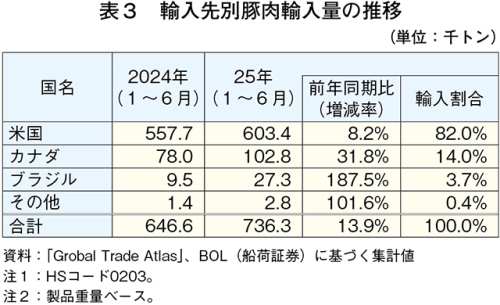 同期の豚肉輸入量は、生産量を上回る国内需要の高まりから、73万6300トン(同13.9%増)とかなり大きく増加した(表3)。輸入先別に見ると、米国・メキシコ・カナダ協定(USMCA)により米国やカナダ産の堅調な輸入が続く中、ブラジル産は2万7300トン(同2.9倍)と大幅に増加した。これは、メキシコ政府によるインフレ率上昇抑制策(PACIC)の下で、一時的に豚肉の輸入関税が撤廃されていたことが有利に働いた。
