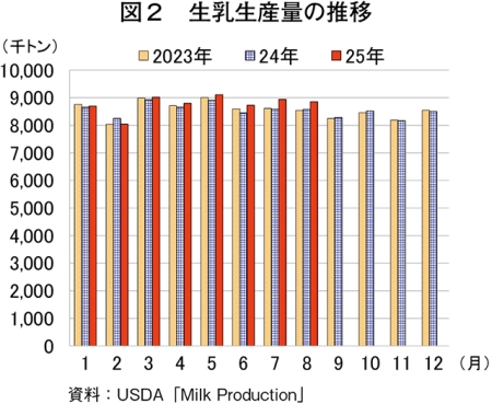 米国農務省全国農業統計局(USDA/NASS)によると、2025年8月の乳用経産牛飼養頭数は952万頭(前年同月比1.9%増)とわずかに増加した(図1)。これは、乳価が堅調に推移していることや、後継牛価格の上昇により乳牛群の更新が難しい中、乳用経産牛を保留する傾向が強まっていることが要因とされている。同月の生乳生産量は、乳用経産牛飼養頭数および1頭当たり乳量(同1.4%増)の増加により、885万4000トン(同3.2%増)とやや増加した(図2)。