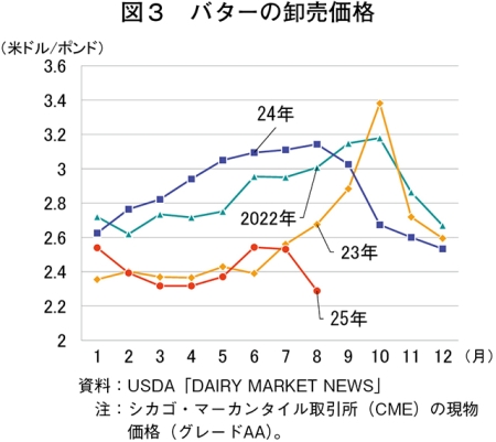 米国農務省農業マーケティング局(USDA/AMS)によると、2025年8月のバター卸売価格は、生乳生産量や生乳に含まれる乳脂肪分増加によるバター供給量の増加から、1ポンド当たり2.29米ドル(1キログラム当たり757円:1米ドル=149.88円(注)、前年同月比27.2%安)と前年同月を大幅に下回り、22年以降の最安値となった(図3)。また、同月のチーズ卸売価格は、生乳生産量の増加に加え、新規加工施設の稼働に伴う生産能力の向上から、同11.0%安の同1.81米ドル(同597円)とかなり大きく下回った。
