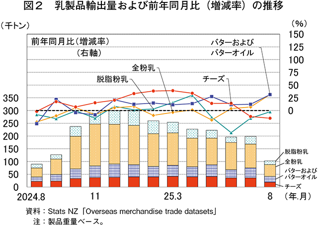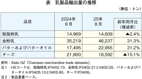 25年8月の全粉乳、バターおよびバターオイルの輸出量増加