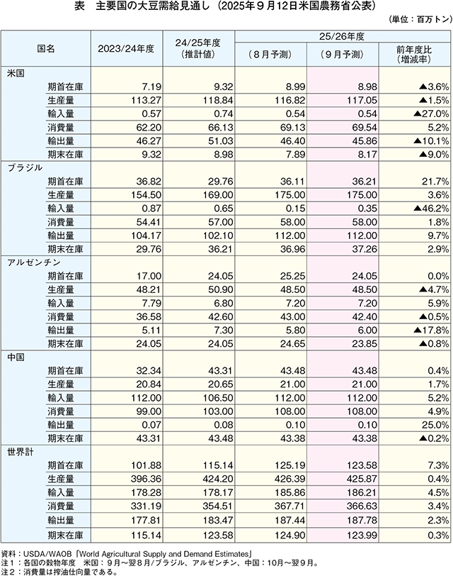 米国農務省世界農業観測ボード(USDA/WAOB)および米国農務省海外農業局(USDA/FAS)は2025年9月12日、25/26年度の世界の大豆需給予測値を更新した(表)。これによると、同年度の世界の大豆生産量は4億2587万トン(前年度比0.4%増)と前月から52万トン下方修正された。このうち、最大の生産国であるブラジルは前月から据え置かれたが、これに次ぐ米国は、作付面積および収穫面積の増加を受けて前月から23万トン上方修正された。