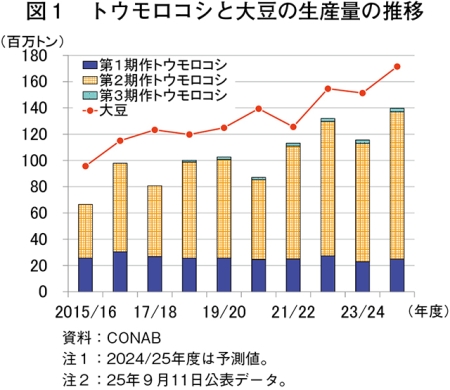 ブラジル国家食糧供給公社(CONAB)は2025年9月11日、24/25年度第12回目となる主要穀物の生産状況等調査結果を公表した。この調査は、春植えの夏期作物(大豆、第1期作トウモロコシなど)や秋植えの冬期作物(第2期作・第3期作トウモロコシ、小麦、大麦、ライ麦など)の生産予測を毎月公表するものである。