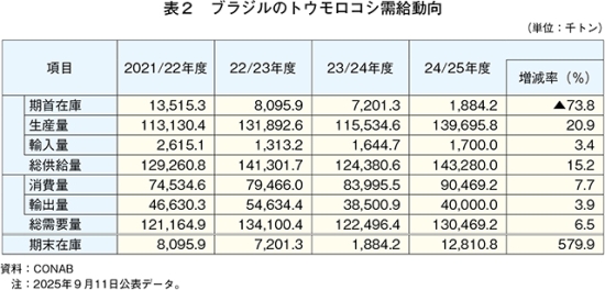 今回の調査で、CONABが大豆の作付面積と単収について見直しを行ったため、20/21年度から24/25年度の生産量が調整されている。また、併せて期末在庫もブラジル地理統計院(IBGE)が公表した数値に基づき調整されている。