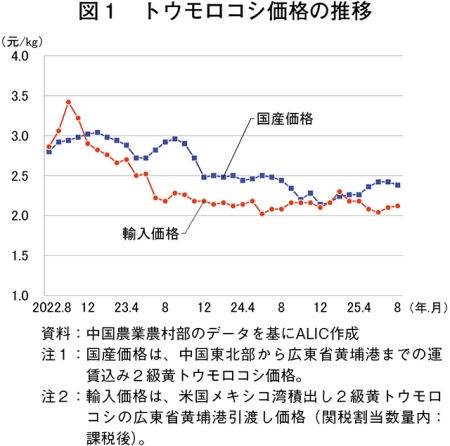 輸入トウモロコシ価格を見ると、養豚主産地の中国南部向け飼料原料集積地となる広東省黄埔港到着は、25年8月が1キログラム当たり2.12元(45円:1元=21.18円(注)、前月比1.0%高)とわずかに上昇した。また、同月の国産トウモロコシ価格(東北部産の同港到着価格)が同2.38元(50円、同1.7%安)とわずかに下落したことで、輸入と国産の価格差は縮小した。