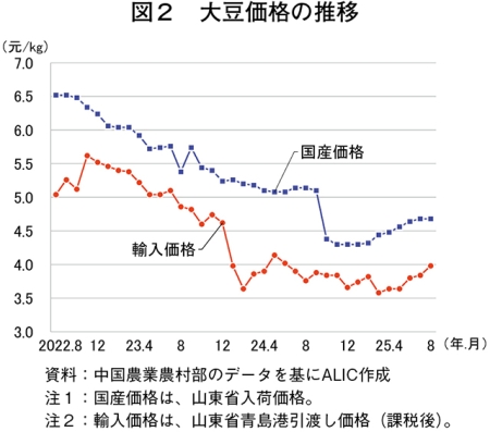 各地の価格動向を見ると、主産地である黒竜江省の食用向け国産大豆平均取引価格は、25年8月が1キログラム当たり4.08元(86円、前年同月比12.9%安)と前年同月をかなり大きく下回ったものの、2カ月連続で前月水準を維持した。また、大豆の国内指標価格の一つとなる山東省の国産大豆価格は、同4.68元(99円、同8.9%安)と前年同月をかなりの程度下回ったものの、前月水準を維持した。さらに、同月の輸入大豆価格は同3.98元(84円、前月比5.9%高)となり、輸入と国産の価格差は縮小した。