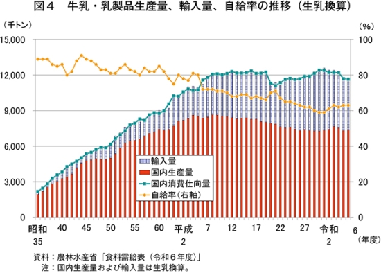 令和6年度の牛乳・乳製品自給率、前年と同水準の63%