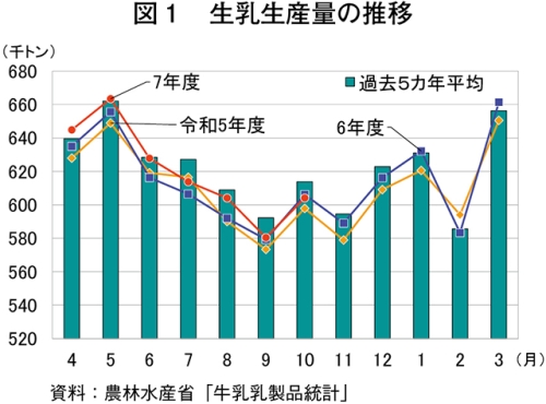 令和7年10月の生乳生産量は、60万4114トン(前年同月比0.3%減)と8カ月ぶり、前年2月のうるう年による影響を踏まえると実質15カ月ぶりに前年同月を下回った(図1)。地域別では、北海道が35万3438トン(同0.2%減)となり、15カ月ぶりに前年同月を下回った。また、都府県でも25万676トン(同0.5%減)と、2カ月連続で前年同月を下回った。