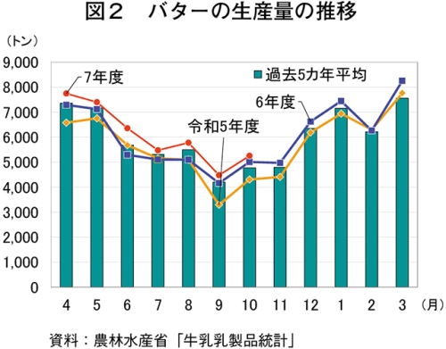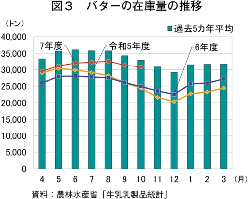 10月のバターの生産量は5254トン(前年同月比4.8%増)と、8カ月連続で前年同月を上回った(図2)。一方、出回り量は6836トン(同2.6%減)と5カ月連続で下回った(農畜産業振興機構調べ)。在庫量については、14カ月連続で前年同月を上回り、10月末は3万851トン(同24.0%増)となった(図3)。
