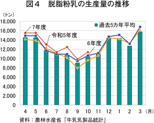 10月の牛乳等生産量を見ると、飲用牛乳等のうち牛乳は、26万6700キロリットル(前年同月比2.8%減)と前年同月を下回った。成分調整牛乳は前年割れが継続しており、1万7002キロリットル(同7.1%減)となった。また、加工乳については、1万1772キロリットル(同9.2%減)と3カ月連続で前年同月を下回った。