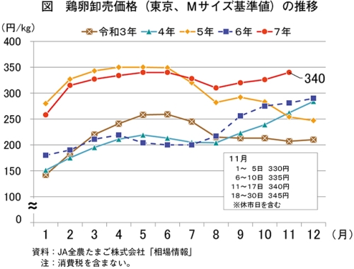令和7年11月の鶏卵卸売価格(東京、Mサイズ基準値)は、1キログラム当たり340円(前年同月差59円高、前年同月比21.0%高)と、前年同月の同価格を大幅に上回った(図)。同価格の日ごとの推移を見ると、月初の同330円から6日には同335円、11日には340円、18日には345円と計3回の上昇があり、月間の上昇幅は同15円となった。なお、過去5カ年の11月の平均卸売価格は235円であり、それと比較しても、44.7%高と大幅に上回る結果となった。