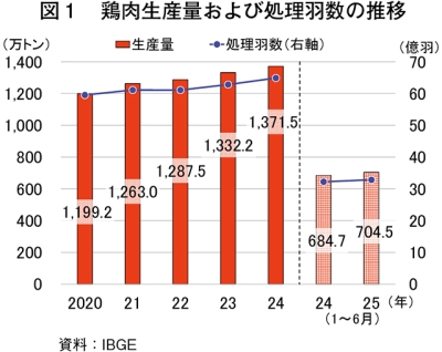 ブラジル地理統計院(IBGE)によると、2025年1〜6月の鶏処理羽数は32億8580万羽(前年同期比1.9%増)、鶏肉生産量は704万5000トン(同2.9%増)と、いずれも過去最大を記録した前年をわずかに上回るペースで推移している(図1)。
