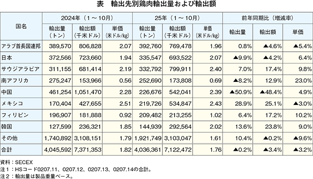 25年1〜10月の鶏肉輸出量は前年同期並み