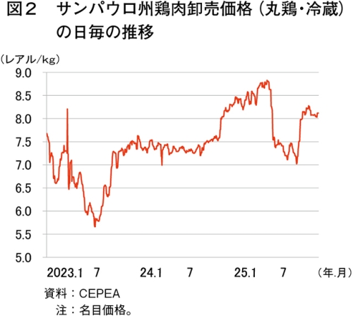 サンパウロ大学農学部応用経済研究所(CEPEA)によると、直近(2025年11月24日時点)のブラジルの鶏肉卸売価格(サンパウロ州)は、1キログラム当たり8.12レアル(240円:1レアル=29.55円(注2)、前年同日比0.7%安)となった(図2)。HPAIの発生以降、下落傾向が続いていたが、各国の輸入停止措置の解除が進んだ結果、9月に入り上昇傾向に転じた。前述したEUによる輸入停止措置の解除に伴い、ブラジル国内の業界は楽観的な見方を強めている。また、同国業界関係者は、輸出の回復とクリスマスシーズンによる国内需要の増加に伴い、25年末まで価格は堅調に推移すると見込んでいる。