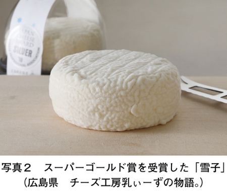 また、22品のうち3品がゴールド賞を獲得し、このうち養沢ヤギ牧場チーズ工房(東京都)が出品した「養沢ヤギチーズ」と、チーズ工房乳ぃーずの物語。(広島県)が出品した「雪子」の2品がスーパーゴールド賞を受賞した(写真1、2)。さらに「養沢ヤギチーズ」は、この大会で日本のチーズ最高順位である14位となり、BEST JAPANESE CHEESE賞に選ばれた。