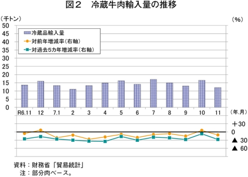 なお、過去5カ年の11月の平均輸入量との比較では、冷蔵品は27.6%減と大幅に下回った一方、冷凍品は14.9%増とかなり大きく上回る結果となった。