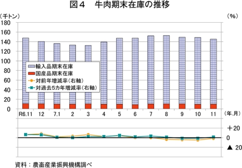 11月の推定期末在庫は、14万5424トン(前年同月比1.5%減)と前年同月をわずかに下回った(図4)。このうち、国産品は1万25トン(同7.7%減)とかなりの程度、在庫の大半を占める輸入品は13万5399トン(同1.0%減)とわずかに、いずれも前年同月を下回った。