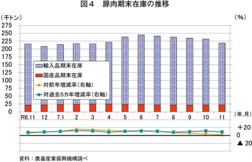 11月の推定期末在庫は、21万9130トン(前年同月比1.4%増)と前年同月をわずかに上回った(図4)。このうち、輸入品は、19万6931トン(同1.1%増)と前年同月をわずかに上回った。