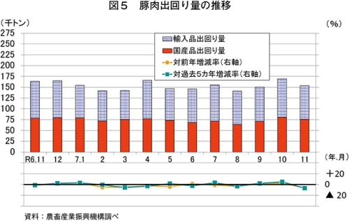 推定出回り量は、15万3757トン(同6.0%減)と前年同月をかなりの程度下回った(図5)。このうち、国産品は7万5962トン(同2.9%減)とわずかに、輸入品は7万7794トン(同8.8%減)とかなりの程度、いずれも前年同月を下回った。