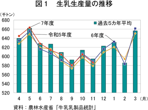 令和7年11月の生乳生産量は、58万6189トン(前年同月比0.5%減)と2カ月連続で前年同月を下回った(図1)。地域別では、北海道が33万9965トン(同0.3%減)と、2カ月連続で前年同月を下回った。また、都府県では24万6224トン(同0.7%減)と、3カ月連続で下回った。